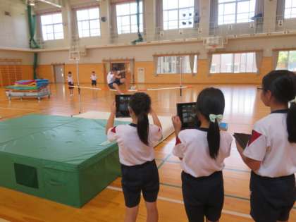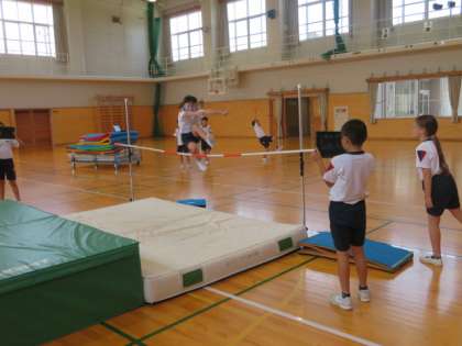 友達が跳ぶときのフォームを動画で撮り、よかったところや気になるところ等をチェックし合いました。
