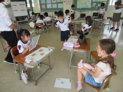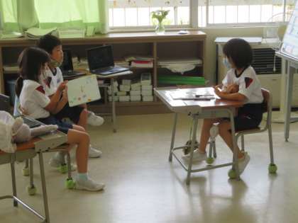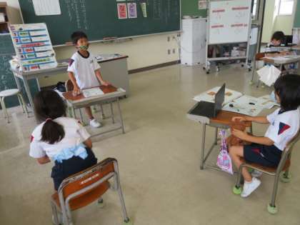 自分の好きな物とそのわけを友達に伝えています。発表者・質問者・動画撮影者に分かれ、順番に発表しました。自分の発表したい内容や聞きたい質問をしっかり伝えていました。PCでの撮影も、初めての挑戦です。