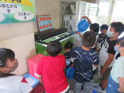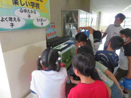 水槽から「ゴー」という音が聞こえ、濾過器の水が流れていなかったので、急遽水を入れ、直していました。音がやみ、水が巡回するようになって一安心。金魚もうれしそうです。