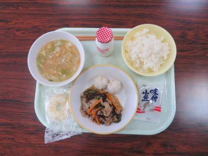 ごはん 味噌汁 エビパオツ もずくのチャプチェ 冷凍パイン ヨーグルト 味付け小魚 でした。
