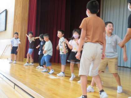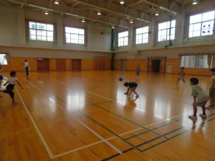 今日はあいにくの雨模様。体育館では、ドッジボールやバスケットボールで遊んでいます。ステージでは、7/7に行う七夕集会での劇の練習中です。本番が楽しみです。
