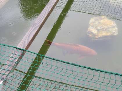 用水路の水が少なくなっている場所で、一匹の大きな鯉が動けなくなってところを地域の方が助け出し、学校に持ってきてくださいました。その大きな鯉を正面玄関前の池に放しました。鯉は静かに泳いでいます。