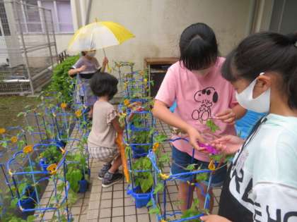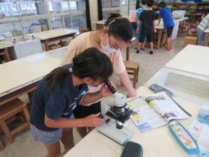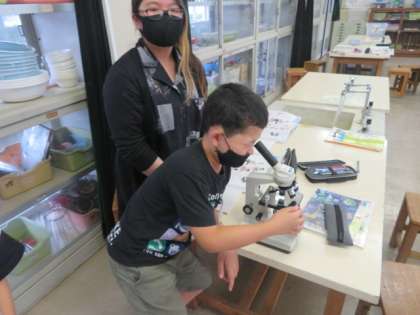 農園や中庭に咲いている草花の花粉をセロテープに擦り移し、顕微鏡で観察しました。教科書と同じ形の花粉を見付け、肉眼では見えない小さな世界に驚いていました。
