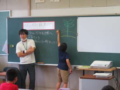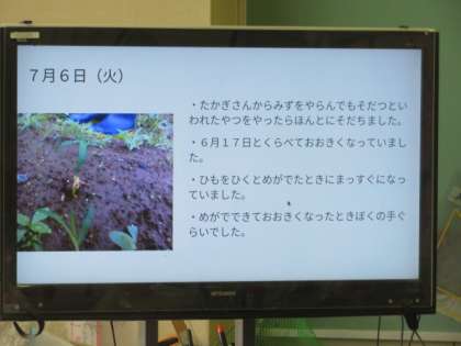 自分たちがPCでまとめた大豆の成長記録を大きな画面で共有しながら発表しました。地域の方に教えていただいたことも生かしながら、今後の世話の仕方について考えました。