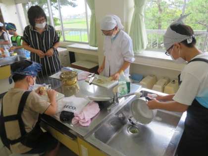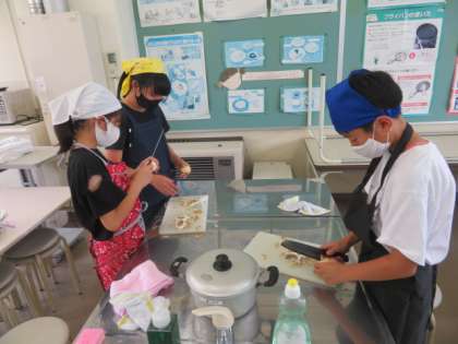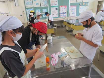 じゃがいもとほうれん草をゆでる調理実習をしました。じゃがいもの皮をむくのが難しかったけれど、ゆで時間を考え、食べやすい大きさに揃えて調理しました。