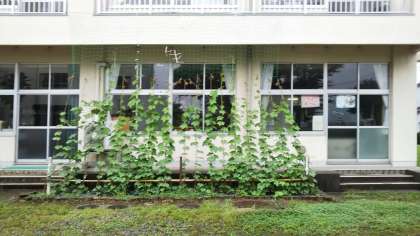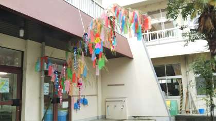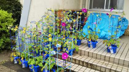 みんなの願いの込められた笹を玄関前に飾りました。気が付けば朝顔はきれいな花を咲かせ、ヘチマは、ぐんぐん成長しています。