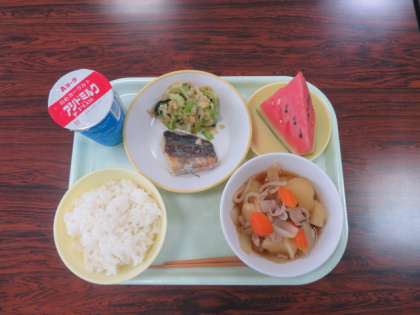 ごはん 肉じゃが 鰆の塩焼き はりはり和え すいか ヨーグルト でした。