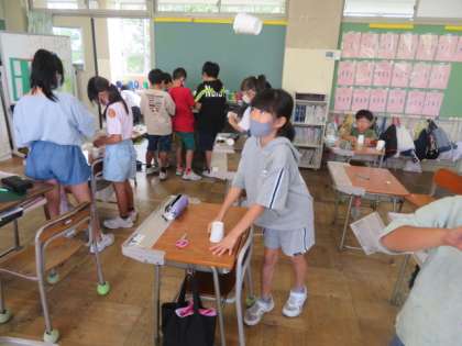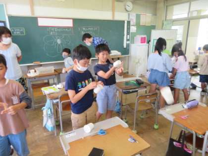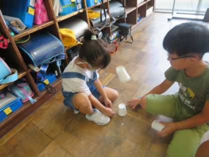 紙コップにゴムを引っかけ、勢いでどこまで跳ぶのか実験しました。跳ぶこつは、何だったでしょうか。