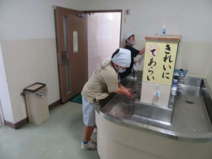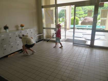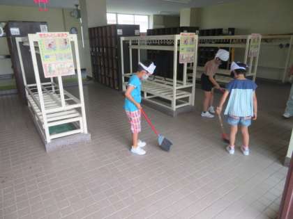 高学年も宿泊学習から戻り、全員そろっての掃除。とても集中しています。