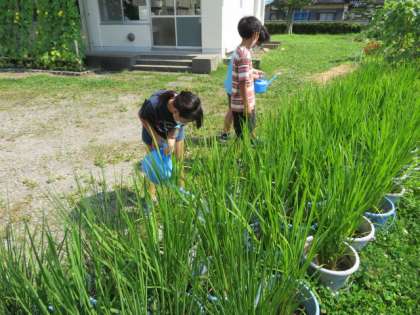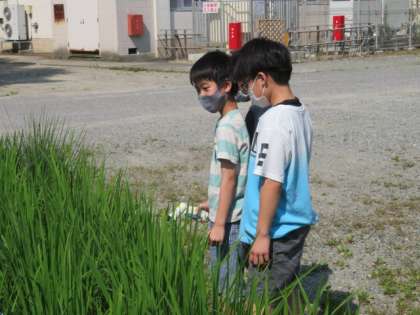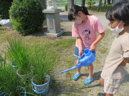 立派に育ったバケツ稲。夏休みを前に、たっぷりと水を入れました。