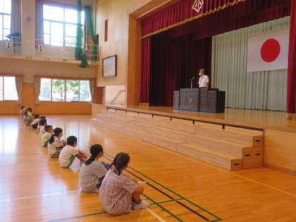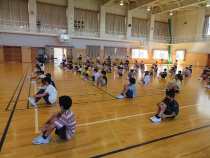 始業式で、人と人との間隔を大きく空け、換気をしっかり行いながら体育館で行いました。校長先生から「新型コロナウイルスの予防をしっかりしましょう」「正しいと思うことは、自分で考えて判断して行動しましょう」話があり、子供たちは姿勢を正し、真剣に聞いていました。