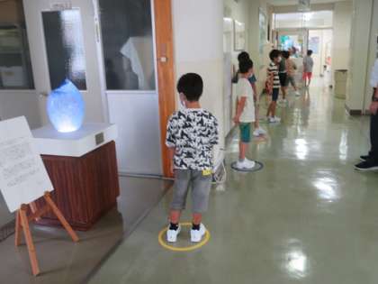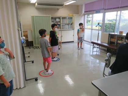 全校児童の視力測定を行いました。間を空け、おしゃべりをせず静かに行っています。