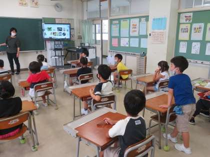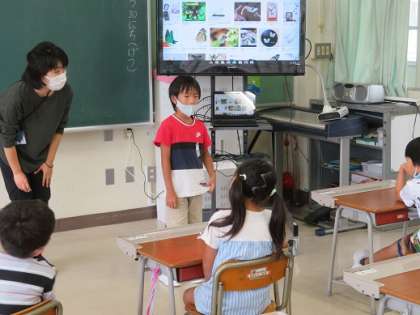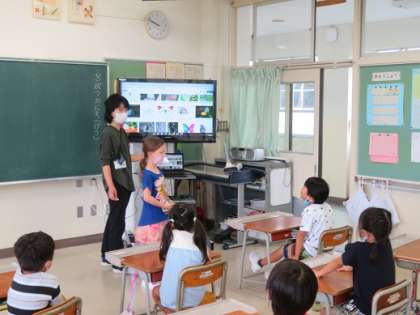 学校の敷地内にはどんな生き物がいるのか、知っていることや想像したことを話し合いました。生き物と仲良くするために大切なことを考えながら、この後どうしていくのか、考え中の子供たちです。