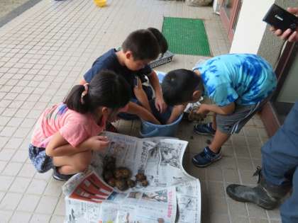 1限目にジャガイモ掘りをしました。少し小さめものが多かったですが、どれも形がよく、実がぎっしり詰まっているようでした。大休憩時に学校に来られた野菜名人。子供たちのためにと野菜作りの本を持ってきてくださいました。早速子供たちは、お礼を言いにきました。まだまだ、子供たちと野菜の関係は続きそうです。