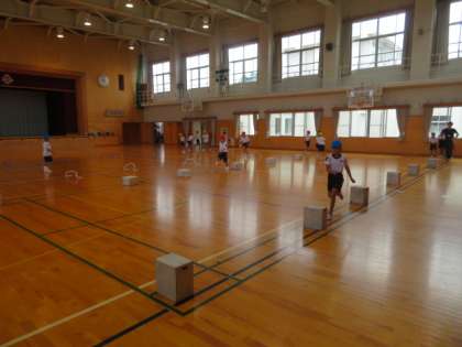 ミニハードルや段ボールの間をリズムよく走る練習をしています。軽快に走り抜けています。