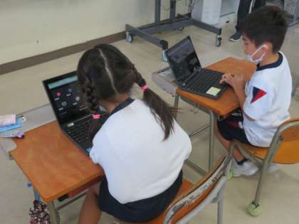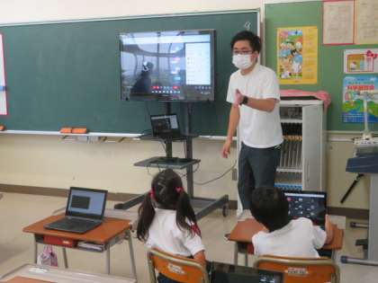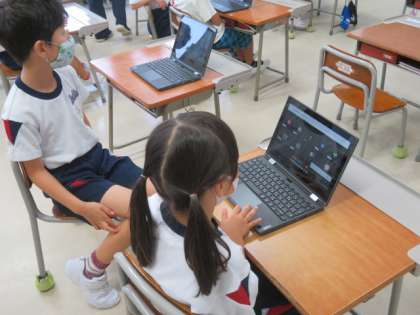情報担当の先生の説明を聞きながら、オンラインの授業のやり方を体験しました。先生や友達の声や顔がPCを通して伝わってくることに驚いていました。やがて、家庭でのオンラインに活用できるようにしていきます。