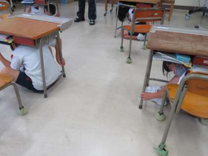 大きな地震発生を想定したシェイクアウト訓練を行いました。放送を聞いた後、子供たちは机の斜め対角線に当たる脚をしっかり持ちながら机の下に入り、静かに待機しました。とても真剣に参加していました。