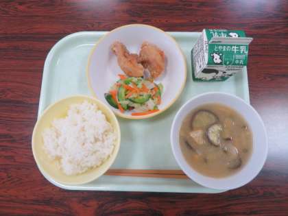 今日の給食は ご飯 鶏肉の米粉揚げ なすの味噌汁 コールスローサラダ 牛乳