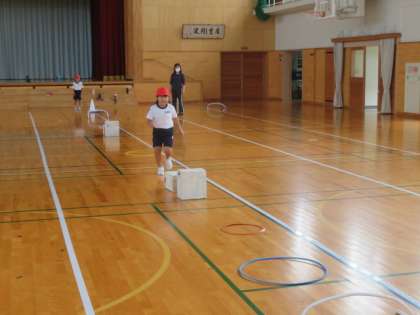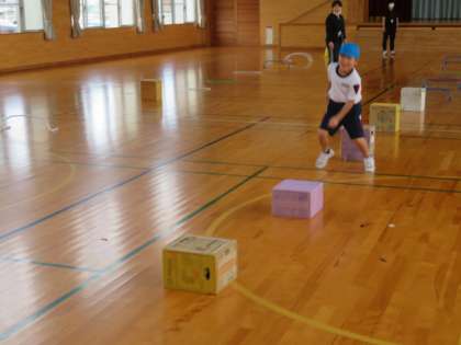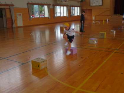 それぞれのコーに、段ボールやミニハードルといった障害物を自分で決めた場所に置き、リズムよく走りきることができるのか試していました。自分に合うお気に入りコースになったでしょうか。