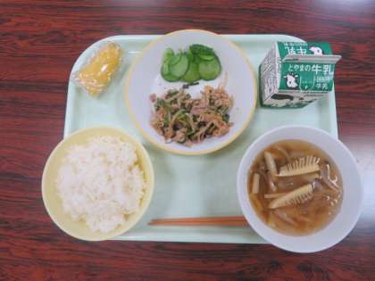 今日の献立は、ご飯  豚肉のキムチ炒め  茎わかめスープ  きゅうりもみ  バナナ