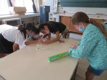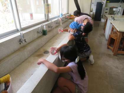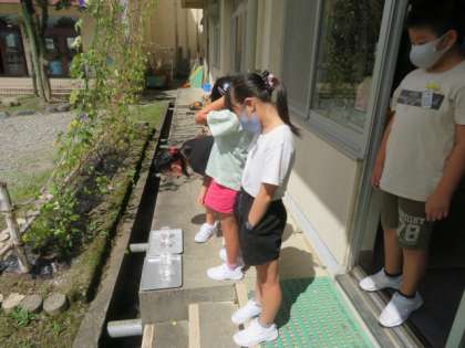 ビーカーの中に入っている水は、ひなたに置くとどうなるのか。比較するためにラップをかけたものとかけないものとを用意して実験しました。実験結果が楽しみです。