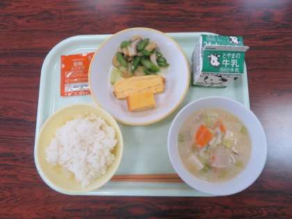今日の献立は、ご飯 呉汁 えびときのこのガーリックソテー 厚焼き卵 ふりかかけ 牛乳 でした。