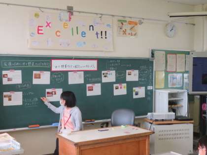自分が考えた「ゆで野菜サラダ」のレシピを紹介し合いました。材料や切り方、見た目など、一人一人の特徴が表れています。