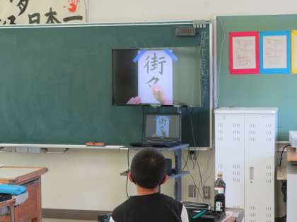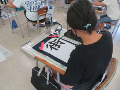 お手本を見ながら、中心や字形、重なりに気を付けながら清書しています。とても落ち着いた態度で集中しています。