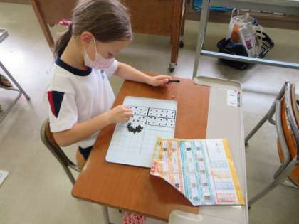 自分たちのアサガオから採った種の数を数えています。学習したことを生かして、10のまとまりをつくりながら正確に数えています。