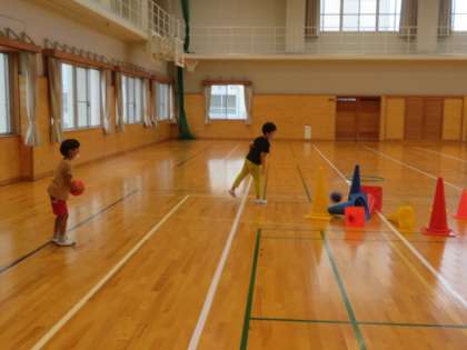 体育館で三角コーンを的にして、的当てゲームをしました。三角コーンの上の方を狙うのが難しかったですが、上手に当てることができました。