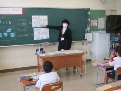 教育実習の先生とさんかくとしかくの形について学習しました。いろいろな形をさんかくとしかくに分けた理由を話し合いながら、それそれのとくちょうをまとめました。