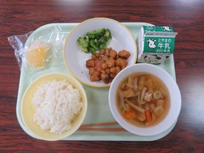 今日の献立は、ご飯 すまし汁 魚とひよこ豆の甘辛目 ゆでブロッコリー 冷凍リンゴ 牛乳 でした。
