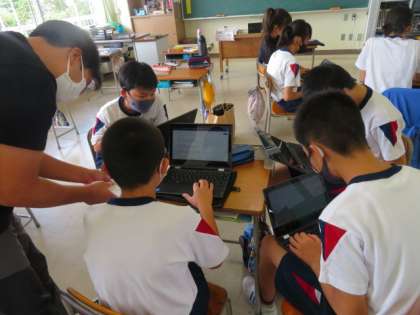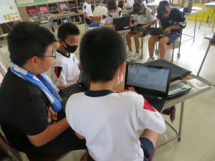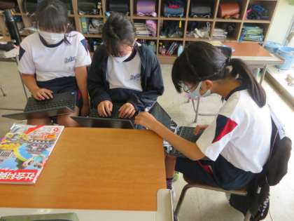 学習発表会で取り上げる歴史上の人物にまつわる事実やエピソード、時代背景を生かしながら、せりふを考えています。PCで、他のグループのせりふを確認し、つかがりを考えながら台本を作っています。