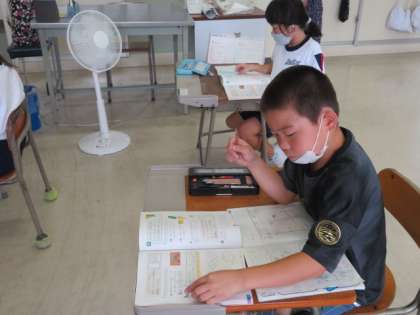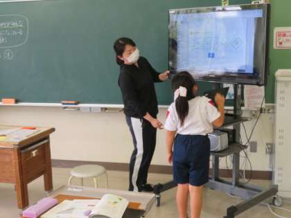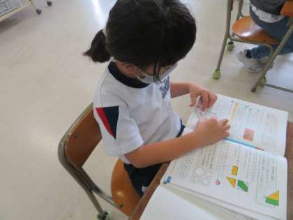 長方形の定義を確認し、どの形が長方形といえるのか考えていました。見た目だけではなく、三角定規で直角を確かめながら見付けていました。