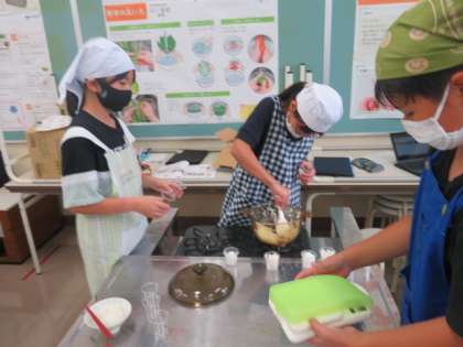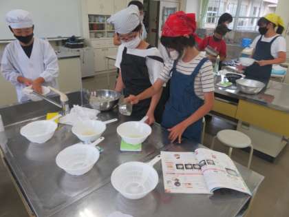 換気、手洗い、間隔の確保をしながら、ご飯つくりをしました。一人分米や水の量、炊く時間やむらす時間などを事前に調べ、調理実習を行いました。