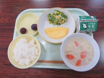今日の献立は、ご飯 白インゲン豆のシチュー オムレツ アスパラサラダ 巨峰 牛乳 でした。