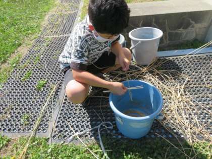 約2週間乾燥させた稲の脱穀作業を行いました。脱穀は、割り箸を使い絞り出した米を牛乳パックの中に集める方法で行いました。