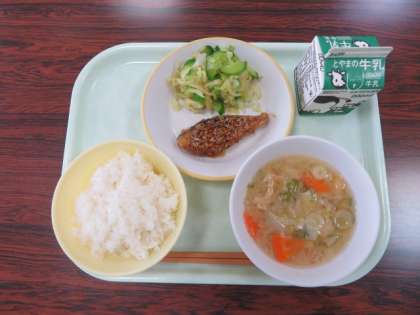 今日の献立は、ご飯 五目味噌汁 ふくらぎのごまだれかけ あわせ合え 牛乳 でした。