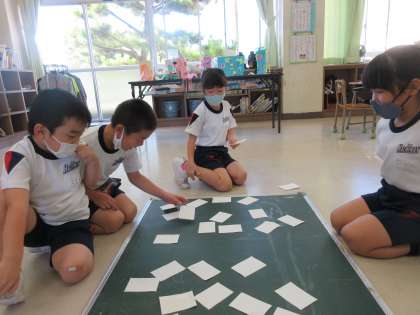 主語と述語のある文をつくり、カードゲームをしました。主語のカードから1枚、述語のカードから1枚ずつ選び、「ぼくは2年生だ。」など、意味のわかる文になれば、カードをもらうことができます。「ぼくはかなしそうだ。」「ライオンは2年生だ。」など、おもしろい組み合わせもできて、みんなで楽しく学習しました。