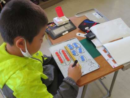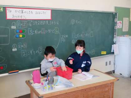 2×5や5×2など、かけ算の式の意味をおはじきを使って考え、説明しました。分かりやすく図にまとめながら説明しています。