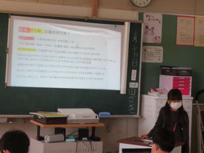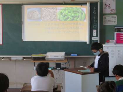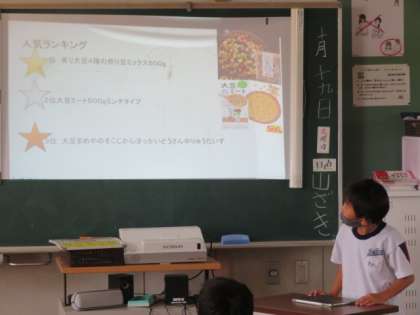 大豆について調べてまとめたことの中間報告をしています。友達の発表を聞いて、まとめ方や調べる内容についてよかった点や改善点などを話し合い、自分の追究につなげていました。