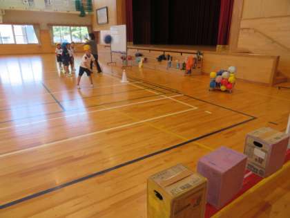箱をねらってボールを投げています。ノーバウンドやワンバウンドで上手に命中させていました。