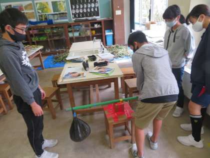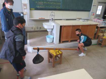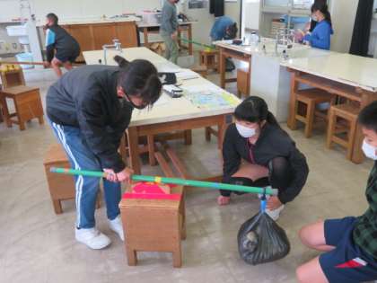 長い棒を使っておもりを持ち上げる実験をしています。力を入れる場所やおもりをつるす場所の違いによって、手応えが全く違うことが分かりました。
