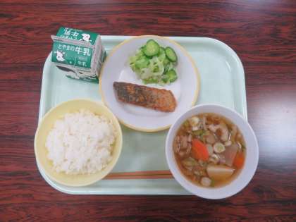 今日の献立は、ご飯 根菜汁 魚の竜田揚げ 添え野菜 牛乳 でした。