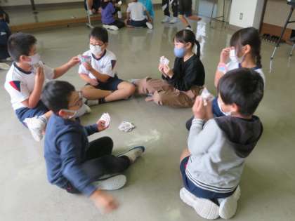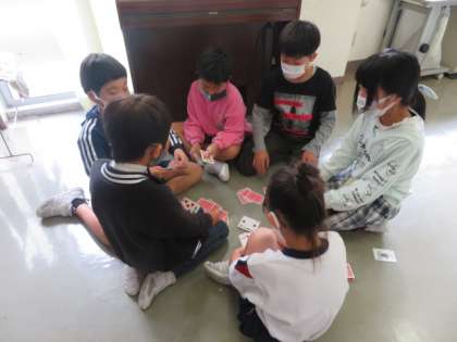 3・4年生で一緒に行く宿泊学習の班が決定しました。その班ごとで初めて集まり、トランプなどをしながら交流を深めています。