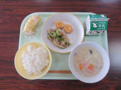 今日の献立は、ご飯 豆乳みそスープ 切り干し大根のペペロンチーノ 人参シューマイ バナナ 牛乳 でした。
