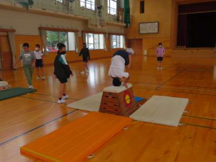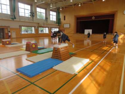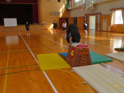 開脚跳びや台上前転など技に挑戦しています。着手や頭の位置、踏み切りの仕方などを確認しながら練習に取り組んでいます。