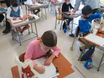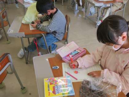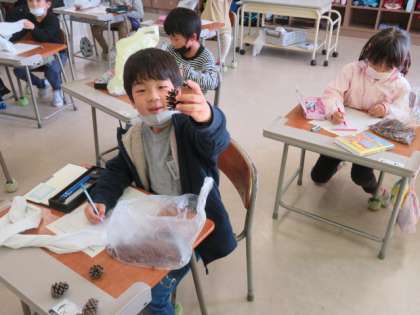 八町にある神社に行って、たくさん松ぼっくりやドングリ、きれな色の葉っぱを拾ってきました。学校に帰ってから、さっそく観察カードにまとめました。