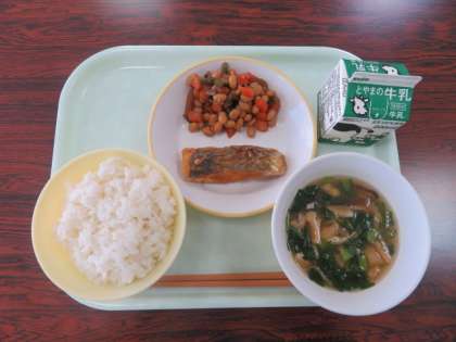 今日の献立は、 ご飯 うすくず汁 揚げ魚のレモン味 五目煮豆 牛乳 でした。