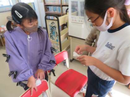 昼休みに、「桃太郎(Peach Boy)」の英語訳した絵本の読み聞かせが行われました。自分たちの知っている昔話と英単語をつなげ想像しながら、物語を楽しみました。参加した人はは、おすすめの本の抽選も楽しみました。